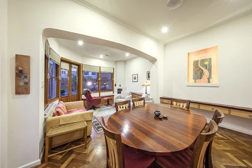 The geometric solidity of the concrete roof and walls is softened by the use of natural sandstone, a kitchen of warm granite, limewashed timber and throughout a soft lime render and hand-laid brick floor. Beautiful blackbutt windows set in arches created from bricks recycled from the former fire-destroyed home frame the farmland and mountain views and give movement and rhythm to the northern and only façade.